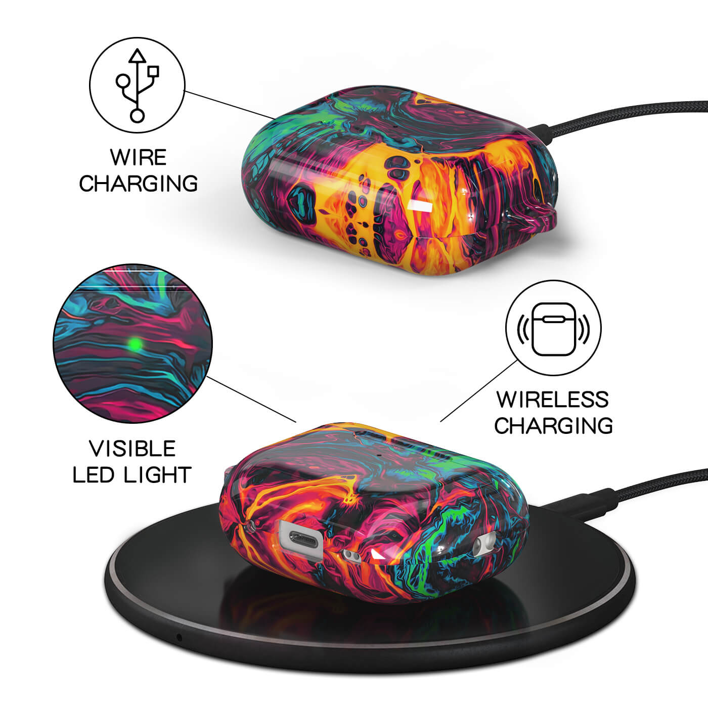 Our cases are wireless charging compatible, allow easy access to the charging port and don't obstruct the LED charging light so you can charge your AirPods Pro without ever having to remove your case.