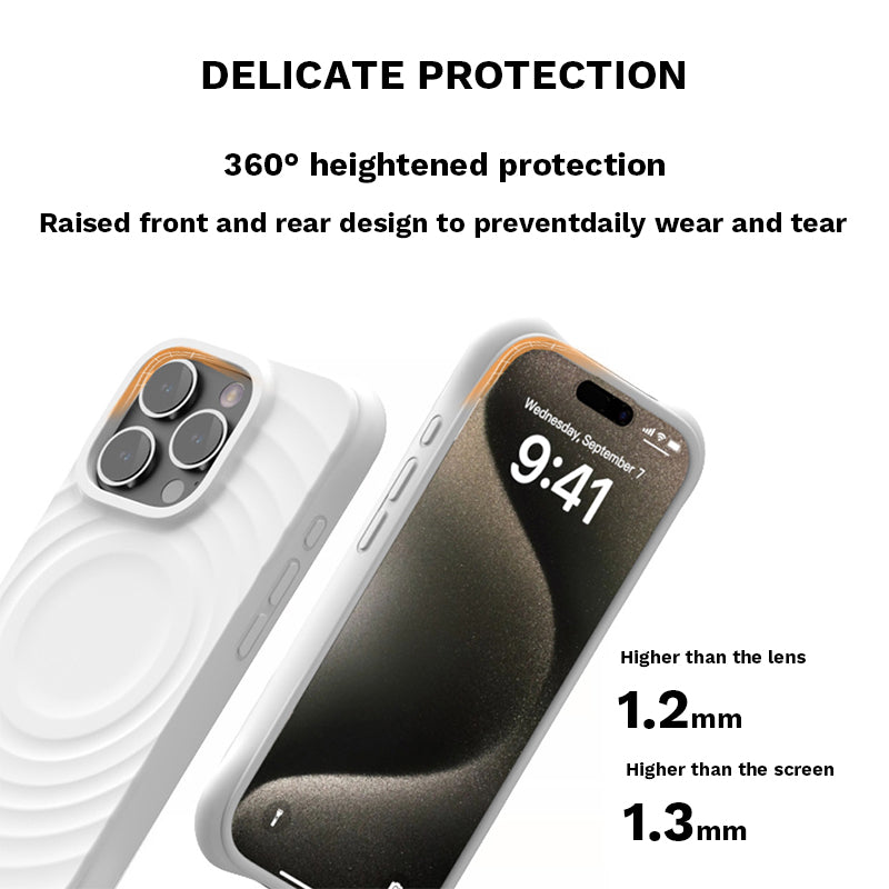 This product is made of soft and flexible silicone material, with more flexible anti-collision corners all around. The 360-degree all-round wrapping not only protects your iPhone well, but the ripple design is more in line with the human grip and has an elegant and fashionable appearance.
