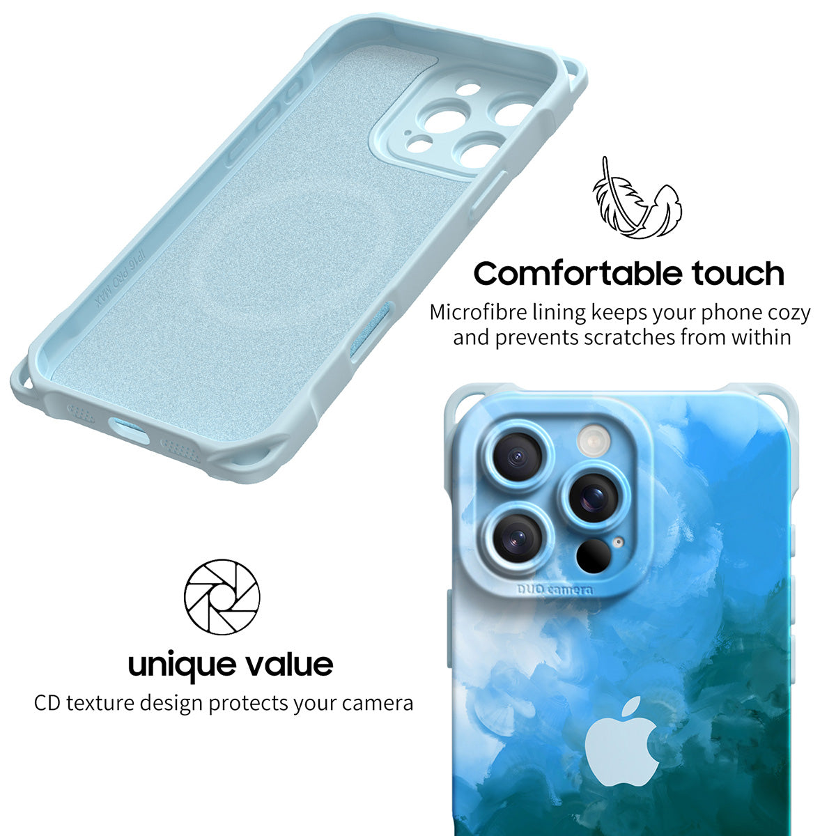 Achieving integrated protection for mobile phone cameras. The hole position of the camera is designed with CD texture, which has a visual impact and looks more beautiful.Microfibre lining keeps your phone cozy and prevents scratches from within.