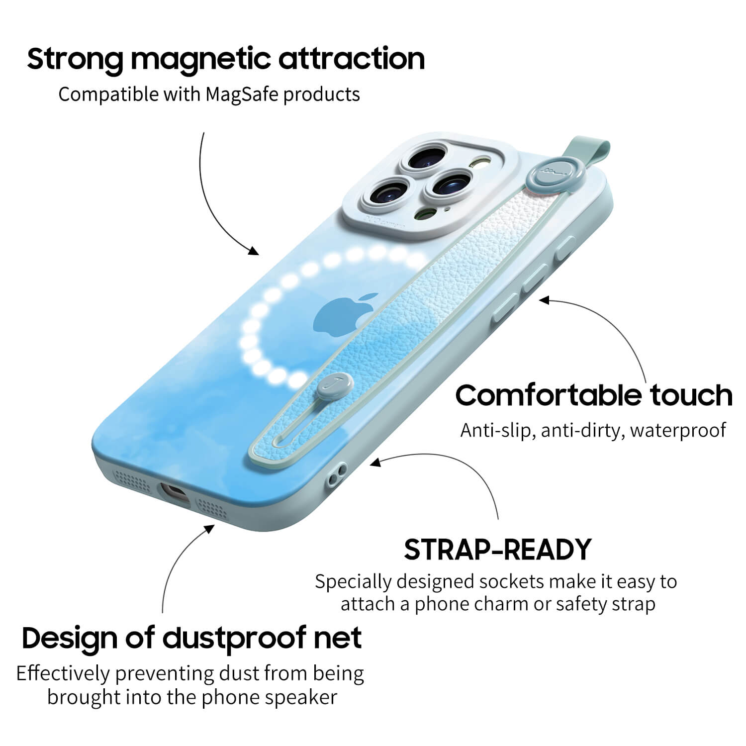 Built In Super Strong MagSafe Core, Enhances Adsorption, Not Easy To Fall Off. Comfortable Texture. Built In Dustproof Holes. Effectively Isolate Dust.