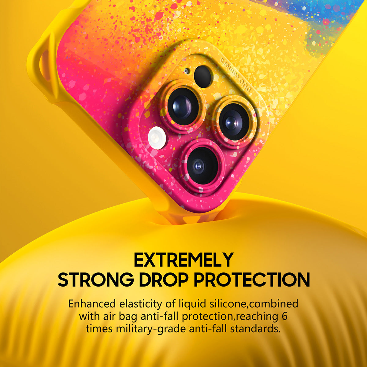 Enhanced elasticity of liquid silicone, combined with airbag anti-drop protection, effectively passed the 6.5-meter drop test and reached 6 times the military-grade drop protection standard.